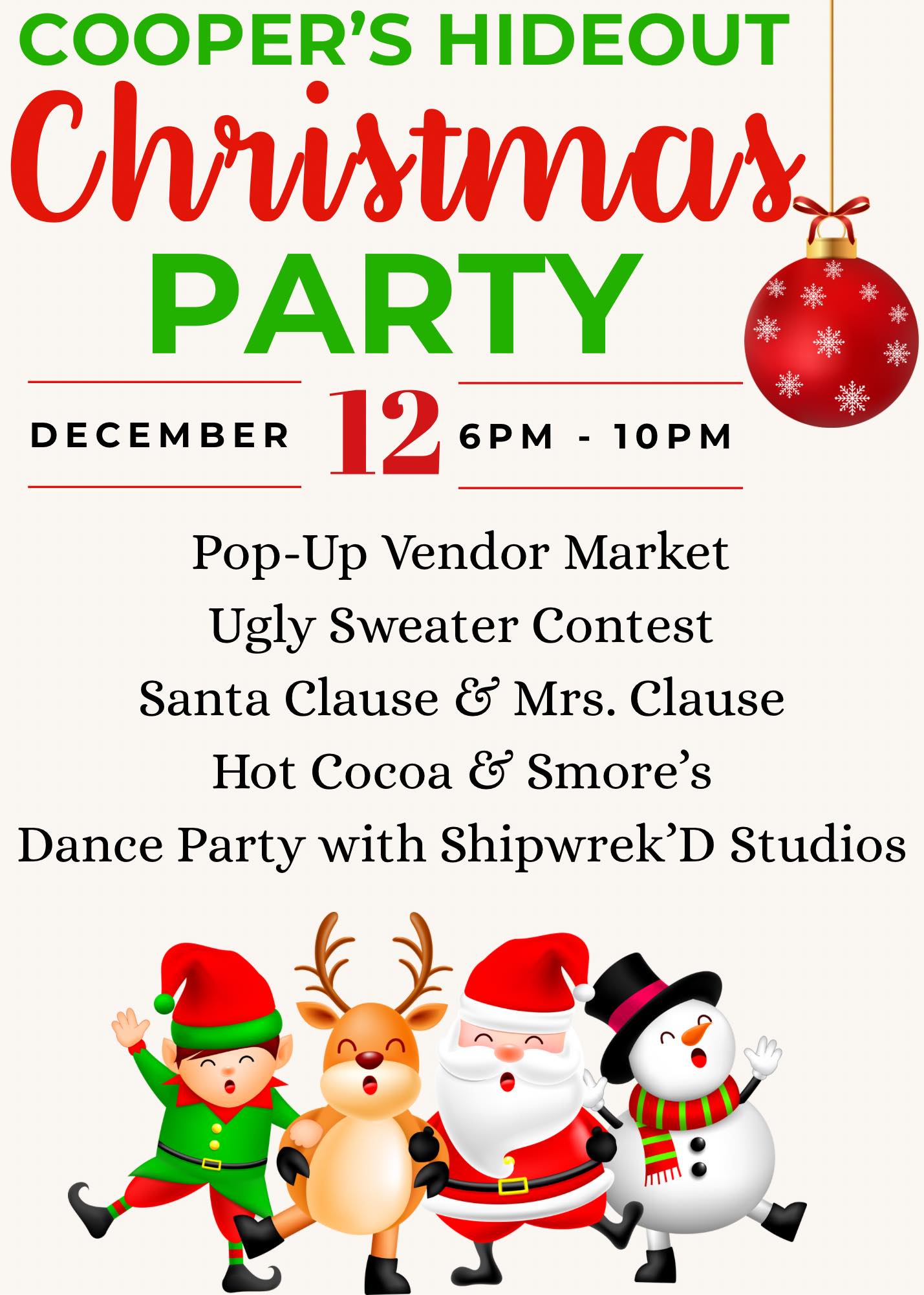 Cooper’s Hideout Christmas Party! Dec 12 Cooper’s Hideout Christmas Party! Featured 6:00 pm - 10:00 pm Cooper's Hideout Learn More