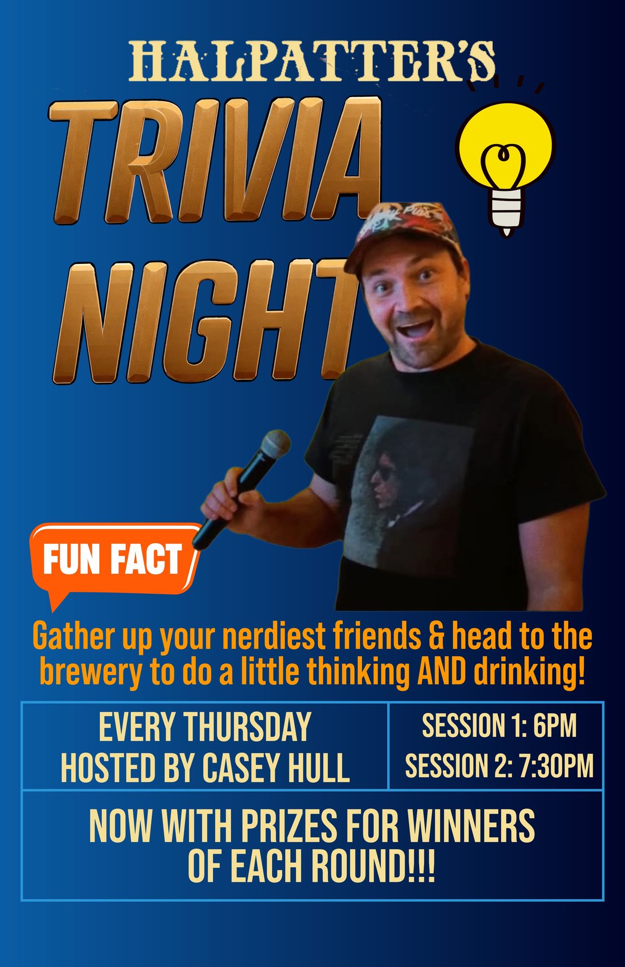 Test your knowledge with our weekly trivia, tasty beer, and food available at Halpatter Brewing Company every Thursday night!