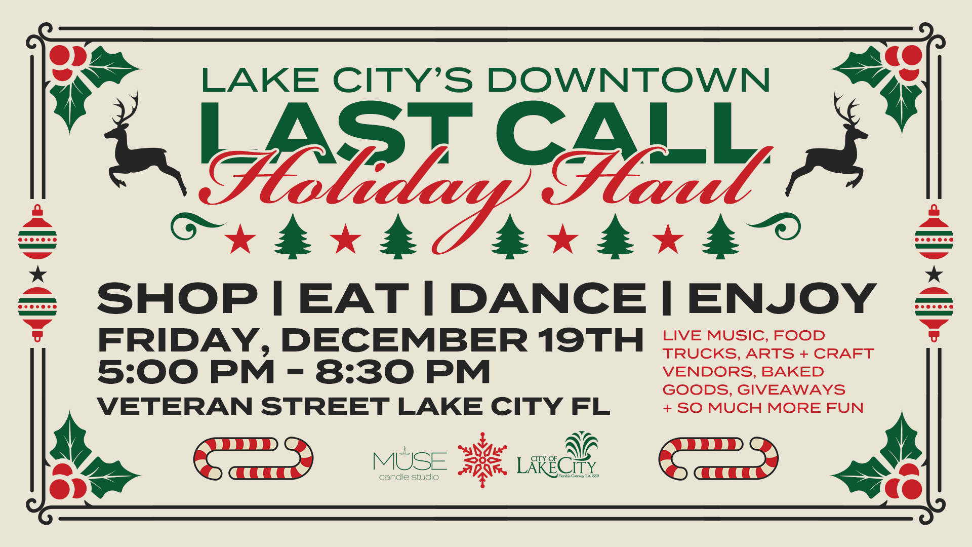 MUSE Candles + Home Fragrances 124 NW Veterans Street, Lake City, FL, United States +1 moreDowntown Lake City will be glowing with Christmas cheer as we wrap up the holiday shopping season with our Last Call Holiday Haul! Stroll through a charming, Christmas-themed market filled with: Local makers & crafters Small businesses & unique holiday gifts Food trucks with seasonal treats Christmas music filling the streets Bring your family and friends and enjoy the […]