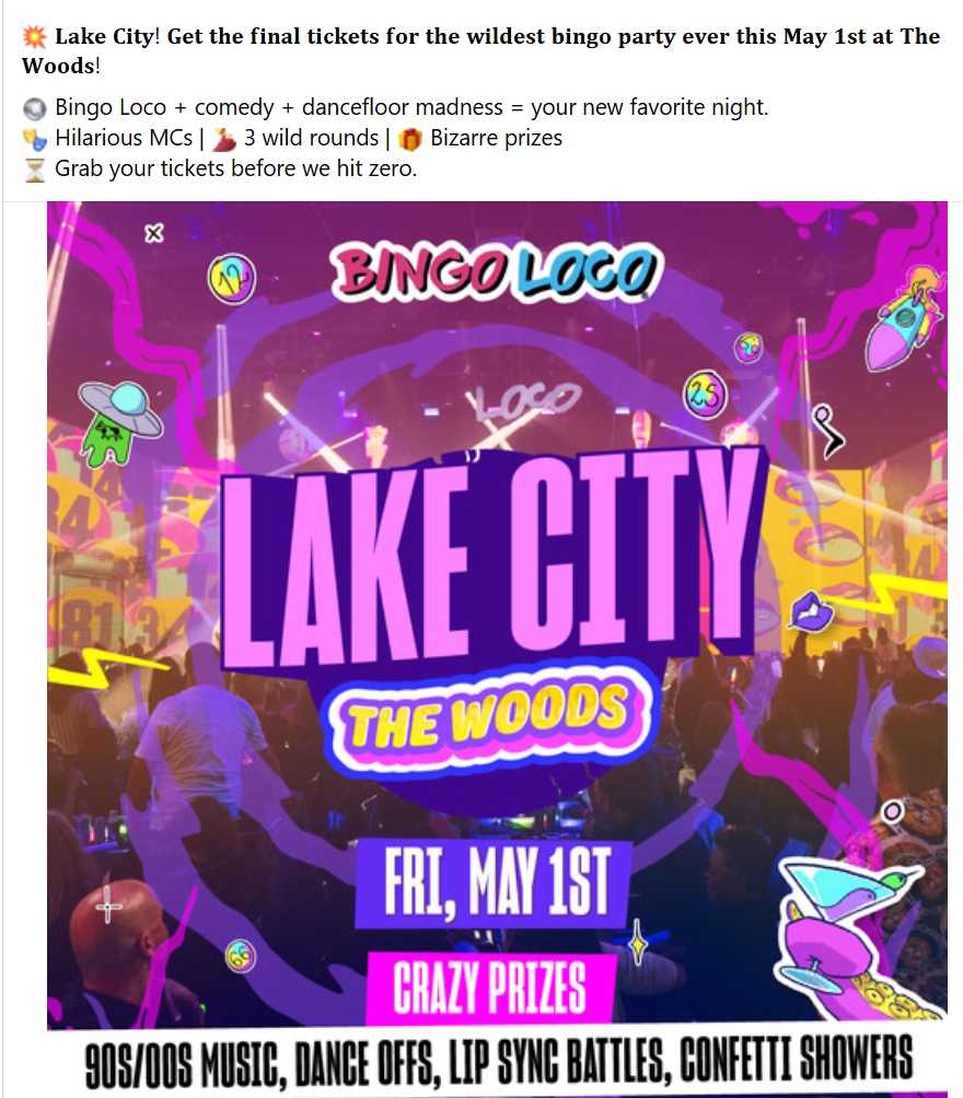 We’re SO excited to announce… for the FIRST TIME EVER in Lake City, Bingo Loco is coming to The Woods. This isn’t your typical bingo night — it’s a full-blown party. high energy all night hilarious hosts dancefloor moments between rounds wild, unexpected prizes Think comedy show + rave + bingo all in one. May […]
